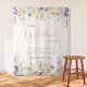 An elegant light cream baby girl shower welcome tapestry and photo backdrop featuring "a little wildflower is on her way" in a blend of grey typography and a stylish pink script, and boho-inspired whimsical watercolors of dainty purple, pink and yellow wildflowers. Add the name of the mother-to-be in simple pink lettering.