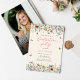 This is a delicate and whimsical graduation party invitation. The design features a colourful and bohemian field of wildflower florals in pretty shades of blue, terracotta, pink, purple and yellow. The butterflies and bees add the finishing botanical elegant touch. There is also a photo on the back with additional personalisation details.