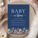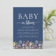 A beautiful watercolor floral border of wildflowers decorates the bottom edge of this trendy boho baby shower invitation. The words "Baby in bloom" appear in serif and script fonts, with swashes before and after the script. Personalise the text with the name of the mum-to-be and the shower details in white on a navy blue background. The back of the card is solid navy blue.