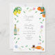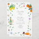 Beautiful whimsical french boho cheese and wine themed modern colourful watercolor wedding engagement invitation with simple botanicals, orange and lemon citrus theme ideal for a sunny summer European themed wedding engagement party. Original artwork by artist Catherine Sweetman includes foliage, wildflowers, french cheese and wine, the french flag, musical notes and wine flutes of sparkling bubbly wine. Whimsical handwriting and modern typography script with easy to personalise templates to add names, the date and other essential information along with the bride and grooms initials on the sparkling wine bottle label illustration. Colour palette includes lemon, yellow, orange, green, blue, purple and pink.