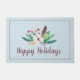 Festive holiday front doormat features Boho style bouquet features fir branches, feathers, holly, berries and white flower on blue background. Customise with name, seasonal message or other festive text