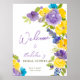 Welcome your guests in style with our charming 'Love is in Bloom' theme bridal welcome sign! Featuring hand-painted flowers in vibrant shades of lavender, purple, yellow, and blue, alongside delicate wildflowers and lush greenery, this sign sets the perfect tone for your romantic celebration. With elegant script font and timeless design, it's the ideal way to greet your loved ones and guide them to your special event