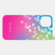 Colourful gradient blend of bright fuchsia pink and blue with a hint of yellow-green with falling bokeh sparkles in white. Personalise with your name or initials in white sans font lettering.