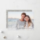 Elegant holiday photo card features a full bleed landscape-oriented photo with a bokeh light flare overlay for a festive and bubbly look. "Happy New Year" or your choice of holiday greeting is overlaid in black script lettering, with your name(s) and the year alongside. Add two additional photos to the back, along with a custom message, on a neutral botanical patterned background.