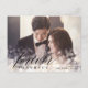 Elegant wedding thank you postcard features a full bleed landscape-oriented photo with a sheer bokeh light flare overlay for a chic bubbly look. "Forever thankful" is overlaid in black script and serif lettering, with your names alongside. Add an additional photo to the back, along with a custom pre printed thank you message, on a neutral botanical patterned background. Space provided for your return address and recipient addressing.