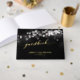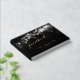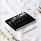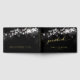 An elegant and sophisticated black and gold wedding guestbook featuring black with shimmering white bokeh lights in the background with gold foil swash calligraphy with your names on the front, spine and back covers in a modern san serif font. The book reads, "guest book,' on the front and wedding on the back in a swash font script with your names and date.