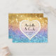 COLOR PALETTE: golden metallic colour, lavender, blue and aqua DESIGN COLLECTION: A matching DIY table seating place card to use for formal wedding receptions, bridal showers or business events. Designed to match the Ticket Stub Corner Style invite option, this design was created with gorgeous warm golden fading to aquak and then bright pink shimmering, glitter look Bokeh image. Modern and trendy, feminine glitzy bling style, this invitation is part of a simple and contemporary wedding invitation set. A semi transparent half round layer with white border has a typographic font typography layout of the text. It has pretty, sweet soft pastel colours and a girly girl feel. Cool, hip and trending - sure to please the bride for her Bridal Shower Invitation and theme.