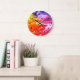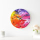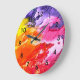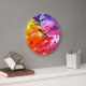 This bold abstract clock will brighten up any room. Colorful background in purple, red, orange, yellow and pink appears to be painted in a heavy textured style. Make a statement and liven up your day.