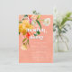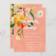 Bright and Bold floral botanical arrangement with colours of yellow, peach, pinks, and white against a peach coral mottled background. Wonderful for a spring, summer, boho or garden Baby shower, bridal shower or any occasion with brunch and champagne!
