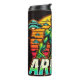 A striking illustration presents two green aliens surrounded by descending UFOs emitting bright light against a retro orange and yellow striped sky. The large, stylised, and textured text "AREA 51" commands attention, highlighting the infamous location.