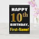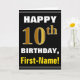 This simple birthday-themed greeting card design features a warm birthday wish like "HAPPY 10th BIRTHDAY, First-Name!" on the front, in bold text on a black coloured background. The birthday number has a faux/imitation gold-like colouring appearance. The name on the front can be customised. The inside features a customisable birthday message. A greeting card like this could be a fun way to deliver birthday wishes to somebody who is celebrating their tenth birthday. [~Z0000275]