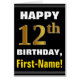This simple birthday-themed greeting card design features a warm birthday wish like "HAPPY 12th BIRTHDAY, First-Name!" on the front, in bold text on a black coloured background. The birthday number has a faux/imitation gold-like colouring appearance. The name on the front can be customised. The inside features a customisable birthday message. A greeting card like this could be a fun way to deliver birthday wishes to somebody who is celebrating their twelfth birthday. [~Z0000275]