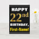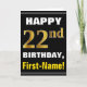 This simple birthday-themed greeting card design features a warm birthday wish like "HAPPY 22nd BIRTHDAY, First-Name!" on the front, in bold text on a black coloured background. The birthday number has a faux/imitation gold-like colouring look. The name on the front can be personalised. The inside features a birthday message that can be personalised. A greeting card like this could be a fun way to deliver birthday wishes to somebody who is celebrating their twenty second birthday. [~Z0000275]