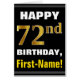 This simple birthday-themed greeting card design features a warm birthday wish like "HAPPY 72nd BIRTHDAY, First-Name!" on the front, in bold text on a black coloured background. The birthday number has a faux/imitation gold-like colouring look. The name on the front can be personalised. The inside features a customisable birthday message. A greeting card like this could be a fun way to deliver birthday wishes to somebody who is celebrating their seventy second birthday. [~Z0000275]