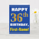 This simple birthday-themed greeting card design features a warm birthday wish like "HAPPY 36th BIRTHDAY, First-Name!" on the front, in bold text on a blue coloured background. The birthday number has a faux/imitation gold-like colouring appearance. The name on the front can be customised. The inside features a birthday message that can be customised. A greeting card like this could be a fun way to deliver birthday wishes to somebody who is celebrating their thirty sixth birthday. [~Z0000278]