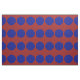 Stylish geometric fabric features bold blue polka dots on a dark red background.