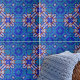 This ceramic tile's design is chraacterised by symmetrical patterns that create a harmonious visual effect. The tile is adorned with an array of geometric shapes, including diamonds and stars, that interlock in a complex, yet aesthetically pleasing manner. The colour palette is dominated by various shades of blue, from the cool tranquillity of turquoise to the depth of navy. These blues are beautifully contrasted by touches of white and red, adding a sense of dimension and vibrancy to the design. The pattern is repetitive, mirroring itself both horizontally and vertically across the tile. This repetition, combined with the distinct outlines of each shape, makes the pattern pop against the colourful backdrop.