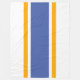 This fun colourful design features golden yellow floating stripes highlighting a wide vibrant bold blue centre stripe against a white background.
