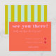 This vibrant and playful RSVP wedding enclosure card features a burst of colour! Fun bright pink fonts on a cheerful red background make this a joy to add to your invitation suite. Turn it over to another fun surprise - green and blue stripes on the backside. Pair with the Blooming Joy wedding invitation collection.