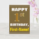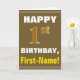 This simple birthday-themed greeting card design features a warm birthday wish like "HAPPY 1st BIRTHDAY, First-Name!" on the front, in bold text on a brown coloured background. The birthday number has a faux/imitation gold-like colouring appearance. The name on the front can be customised. The inside features a birthday message that can be customised. A greeting card like this could be a fun way to deliver birthday wishes to somebody who is celebrating their first birthday. [~Z0000281]