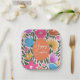 These beautiful Easter paper plates feature a hand drawn floral design in magenta pink, purple, orange, golden yellow, blue, and green over a custom colour background (shown in light pink). Stylish text reading, "Happy Easter" stands out against an orange Easter egg.