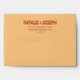 A retro modern hand written bright colourful wedding envelope. Which features bold bride and groom's names in rust colour. And personalised return address . On simple vintage colour background. Which suits the whole wedding suite.