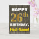 This simple birthday-themed greeting card design features a warm birthday wish like "HAPPY 26th BIRTHDAY, First-Name!" on the front, in bold text on a faux wood appearance pattern background. The birthday number has a faux/imitation gold-like colouring look. The name on the front can be personalised. The inside features a birthday message that can be personalised. A greeting card like this could be a fun way to deliver birthday wishes to somebody who is celebrating their twenty sixth birthday. [~Z0000280]