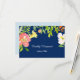 This wedding response card gives the traditional floral wedding theme an updated, modern look. It features a splashy floral border on a dramatic navy blue background. Colours included are pink, yellow, white, tangerine orange and green. Your custom text is in white at the centre. The back of the invitation is solid light blue to make it easy for your respondent to mark. Be sure to see the matching invitation in our store.
