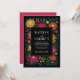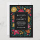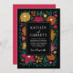 This gorgeous wedding invitation features a hand drawn floral design in magenta pink, orange, golden yellow, and emerald green over a black background. The style is almost chalk - like / pastels. The background colours on both the front and the back can be customised, if desired. Simple, elegant, bold, and modern - perfect for your special day!