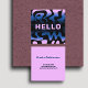 This modern design has the word Hello, in a bold font, on an asymmetric abstract in black, with navy blue, and lilac, light purple.