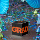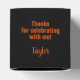 GRAD in bold orange lettering wraps around the front of these black 2" square graduation party favour boxes with your name and thank you message on the top.