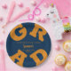 GRAD in bold light orange lettering curves around the edges of these navy blue background graduation party paper plates - available in 2 sizes. Congratulations above the name of your graduate and the Class of below. The perfect addition to your table decor for upcoming grad parties. CHANGE THE COLORS to anything! **TIP: Click on CUSTOMIZE button; click on COLOR box on top right; enter your colour hex code in the #xxxxxx box to match your school colours. SEE ENTIRE COLLECTION of pre-done colour combinations and more ---> http://bit.ly/2EmBPHc <---