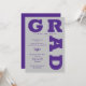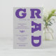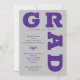 GRAD in bold purple lettering curves around the edges of these grey background graduation party invitations. SEE ENTIRE COLLECTION of pre-done colour combinations, paper plates, napkins, favour boxes and graduation party invitations in our store.