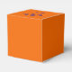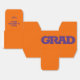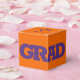 GRAD in bold purple lettering wraps around the front of these orange 2" square graduation party favour boxes with your name and thank you message on the top.