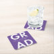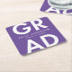 Custom graduation paper coasters featuring "Grad" in bold white lettering with purple background. Personalise the graduation coasters by adding the graduate's name and graduation year. The personalised graduation coasters are perfect for both high school and college graduation parties.
