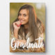 Graduate is written in white handwritten script over your senior portrait photo makes a chic, modern graduation plaque. Customise with your name and high school or university class of 2025 under the bold typography and add your personal details on the back of these elegant text overlay graduate gift