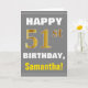 This simple birthday-themed greeting card design features a warm birthday wish like "HAPPY 51st BIRTHDAY, Samantha!" on the front, in bold text on a gray (gray) colored background. The birthday number has a faux/imitation gold-like coloring appearance. The name on the front can be customized. The inside features a birthday message that can be customized. A greeting card like this could be a fun way to deliver birthday wishes to somebody who is celebrating their fifty first birthday. [~Z0000283]