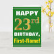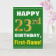This simple birthday-themed greeting card design features a warm birthday wish like "HAPPY 23rd BIRTHDAY, First-Name!" on the front, in bold text on a green coloured background. The birthday number has a faux/imitation gold-like colouring appearance. The name on the front can be personalised. The inside features a birthday message that can be customised. A greeting card like this could be a fun way to give birthday wishes to somebody who is celebrating their twenty third birthday. [~Z0000279]