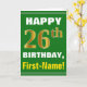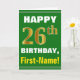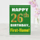 This simple birthday-themed greeting card design features a warm birthday wish like "HAPPY 26th BIRTHDAY, First-Name!" on the front, in bold text on a green coloured background. The birthday number has a faux/imitation gold-like colouring appearance. The name on the front can be personalised. The inside features a customisable birthday message. A greeting card like this could be a fun way to give birthday wishes to somebody who is celebrating their twenty sixth birthday. [~Z0000279]
