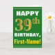 This simple birthday-themed greeting card design features a warm birthday wish like "HAPPY 39th BIRTHDAY, First-Name!" on the front, in bold text on a green coloured background. The birthday number has a faux/imitation gold-like colouring look. The name on the front can be customised. The inside features a birthday message that can be personalised. A greeting card like this could be a fun way to send birthday wishes to somebody who is celebrating their thirty ninth birthday. [~Z0000279]