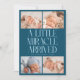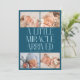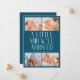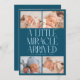 Modern Christmas theme birth announcement card featuring a bold typography text that says "a little miracle arrived" with 4 of your newborn pictures. This is a birth announcement card for the holiday seasons! Add your pictures, birth stats, and a message! The background is teal.