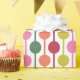 Add some joy to your Christmas gifts with this patterned wrapping paper featuring a simple geometric pattern in a retro 1970s colour palette of red, lime green, orange, pink and green against a white background.