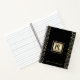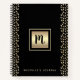 A faux gold foil square with a black script monogram initial and custom name, along with vertical luxe gold oblong dotted patterned bands on black, highlight this chic, girly, modern spiral journal notebook. 8 different inside paper designs to choose from. Makes a stylish statement every time you use it. A great gift for a friend, as well as yourself!