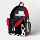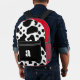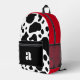 Bold Monogram Cowhide Backpack. A black and white cowhide pattern with a bold red border and a modern font makes this backpack unique. Add your monogram to the front pouch to personalise it. This personalised backpack will protect your possessions while looking very stylish.
