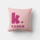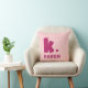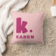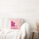 Throw pillow featuring your monogram initial in a big, bold font and your name below. Rose burgundy text on a pink background. Colours are customisable in the design tool.