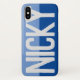 Have your choice of name shown boldly on a two-tone phone case. Example shows the name Nicky. Personalise with your choice of short name.