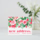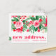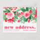 Bold new address Christmas winter moving announcement. With a contemporary bold font typography with hand painted red and green floral Christmas with roses, poinsettias and green pine tree branch and holly berries loose floral watercolor,