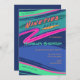 Nineties Party Invitation features a bold coloured typography of "Nineties Party''. This design includes elements of greens, oranges, purple, and pinks, block colours, and abstract design elements inspired by the 90's. Includes a template for personal customisation.