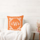 A bold orange throw pillow featuring a customisable three-letter monogram inside a white Greek key geometric border frame. The vibrant white-on-orange design brings energetic, modern style to living rooms, sunrooms, or eclectic spaces. Personalise with your initials or a couple's monogram for a lively personalised gift.
