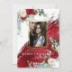 Your Photo Seasons' Greetings - Triple Gold Photo frame - features a big bold paint stroke in a metallic crimson red diagonally across the page and behind the photo frame. Eucalyptus greenery and scarlet red and ivory cream peony flower bouquets grace the corners. Design created by © WhimsicalArtwork™ Customise text, font style, colour and size. We created this template is to make it easy for you to personalise with your own information. This is part of a complete Wedding Stationery Suite with matching wedding, baby shower and other event stationery.